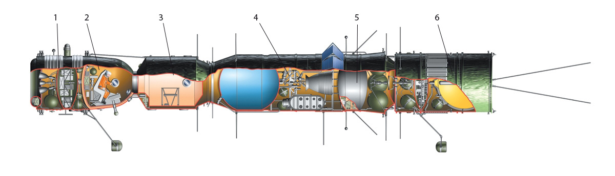 Из-за этого корабль лишился бытового отсека и состоял из спускаемого аппарата и приборно-агрегатного отсека. Приборно-агрегатный отсек, в свою очередь, разделялся на переходный отсек, приборный отсек и агрегатный отсек. Сверху на спускаемом аппарате устанавливался опорный конус системы аварийного спасения. В центральной части конуса имелся проход для доступа космонавтов к гермолюку спускаемого аппарата, через который экипаж корабля должен был совершать посадку в корабль на стартовой позиции. Опорный конус сбрасывался на орбите Земли, перед стартом корабля к Луне.