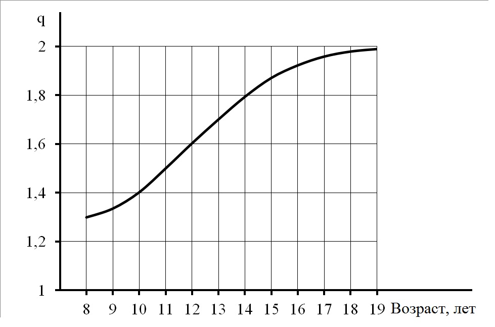 Для мсмк формула с учётом найденных параметров имеет вид , а для мальчиков 10 лет . Для всех остальных спортивных квалификационных уровней значения Li должны лежать между найденными пределами для мсмк и 10-летних детей[5] (с. 227—233).