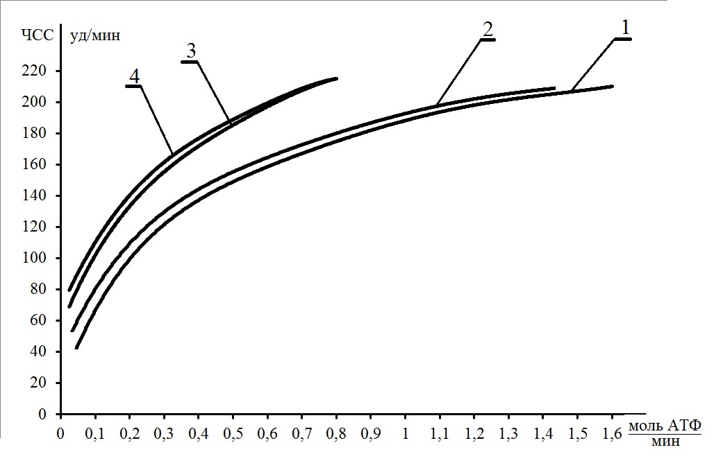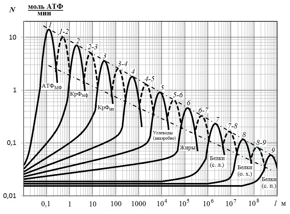 Для аппроксимации зависимости предложена гиперболическая функция (частный случай степенной функции), что предполагает ряд мощностей основных метаболических источников в виде геометрической прогрессии со знаменателем «2». Максимальная мощность метаболического источника № 1 составляет 12,8 моль АТФ/мин, а метаболического источника № 9 — 0,05 моль АТФ/мин. (Расщепление 1 моля АТФ сопровождается выделением 10 ккал энергии).