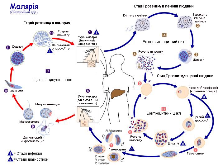 Возбудители инфекции характеризуются сложным циклом развития со сменой хозяина. Бесполое развитие (шизогония) происходит в организме человека, половое развитие (спорогония) — в организме самок комаров рода Anopheles.