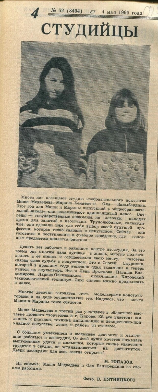 В 1995 г. была отмечена заметкой в местной газете как лучшая ученица ИЗОстудии. На страницах газеты юная художница сфотографирована с лучшей на тот момент своей работой маслом. Уже тогда Мария определилась с выбором будущей профессии.