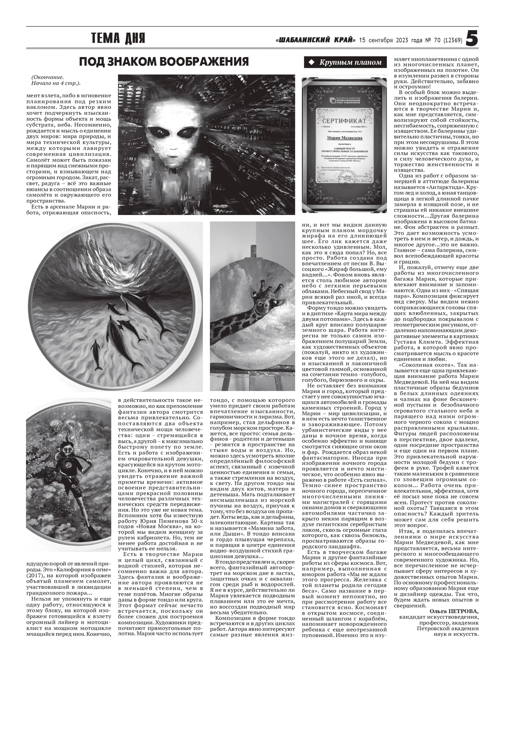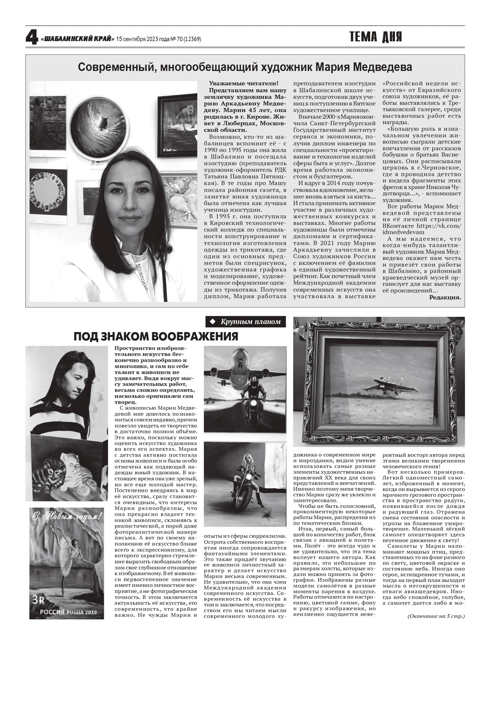 Газета «Шабалинский край» от 15.09.2023. № 70 опубликовала статью «Современный, многообещающий художник Мария Медведева». В этой же газете в статье «Под знаком воображения» о творчестве Марии высказала свое мнение Петрова Ольга Геннадьевна, Кандидат искусствоведения, профессор, академик Петровской академии наук и искусств: стр.4, стр.5. Об этом Мария рассказывает на своем канале Дзен.