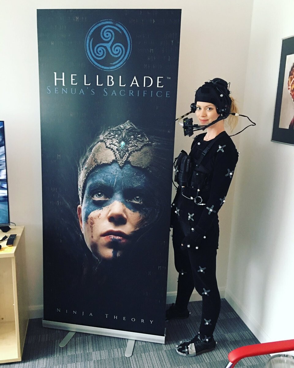 Мелина Юргенс в костюме захвата движения рядом с постером Hellblade: Senua’s Sacrifice