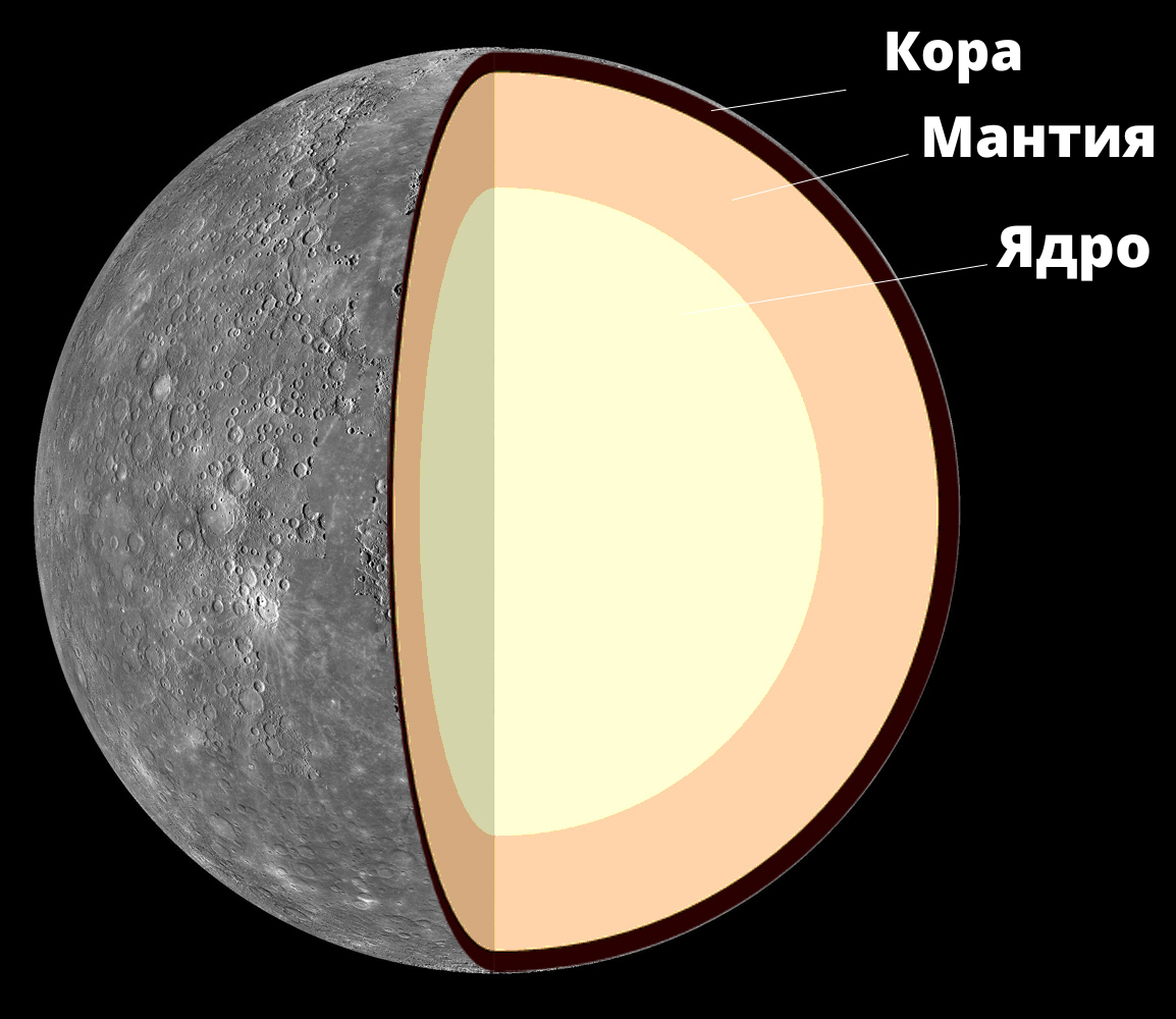 У Меркурия относительно тонкая кора и большое железное ядро, которое генерирует магнитное поле силой примерно в 1% земного.
