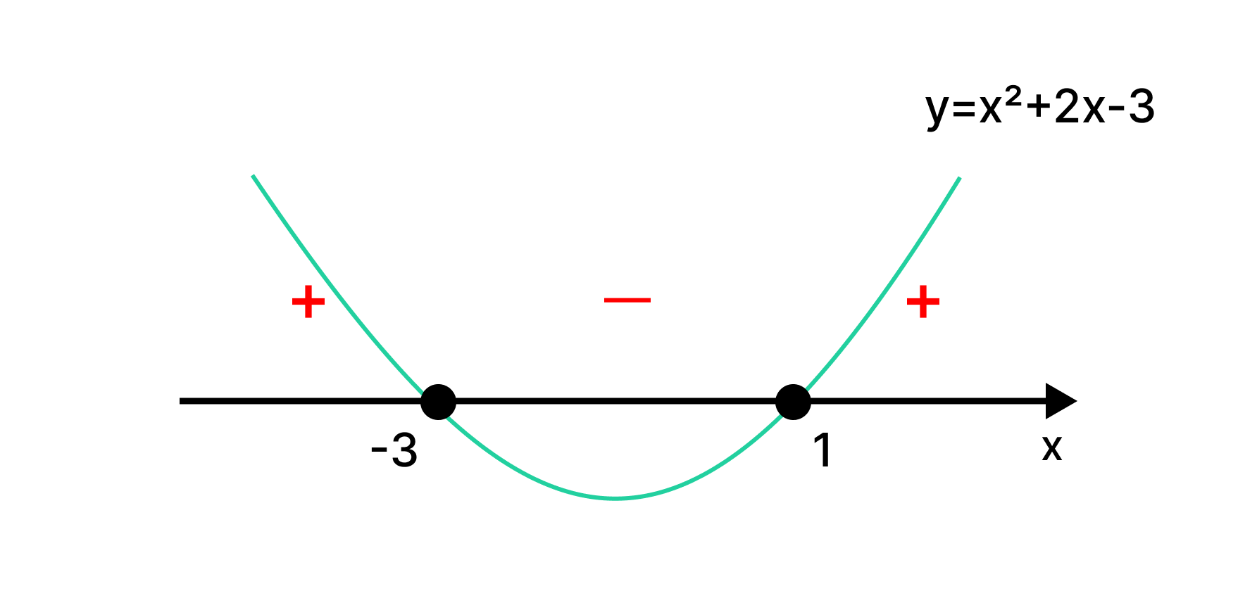 Рассмотрим функцию y=x² + 2x − 3. Её графиком служит парабола, пересекающая ось X в точках −3 и 1. Ветви параболы направлены вверх. На интервалах x < −3 и x > 1 парабола идёт выше оси X; там y > 0 и стоит знак плюс. На интервале −3 < x < 1 парабола идёт ниже оси X; там y < 0 и стоит знак минус[4].