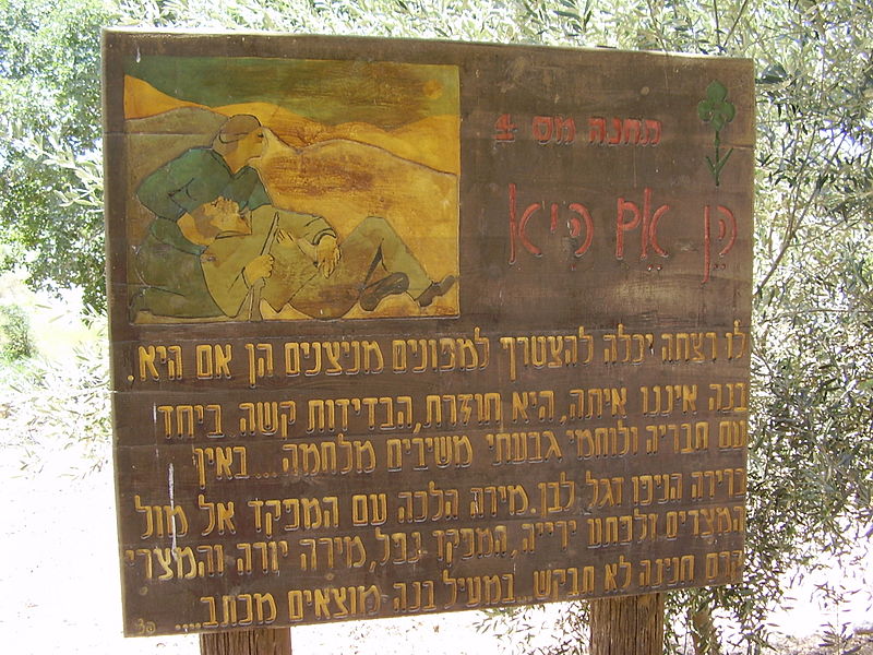 - Авраам берёт белую тряпку, одну из последних, и начинает спускаться по склону к египетским позициям. Идти ему трудно — он ранен, поэтому рядом с ним спускается, поддерживая его, радистка Мира Бен-Ари, девушка, в которую Авраам был безнадёжно влюблён. Весь кибуц знал о его любви, в том числе и муж Миры, отец их с Мирой двухлетнего сына.