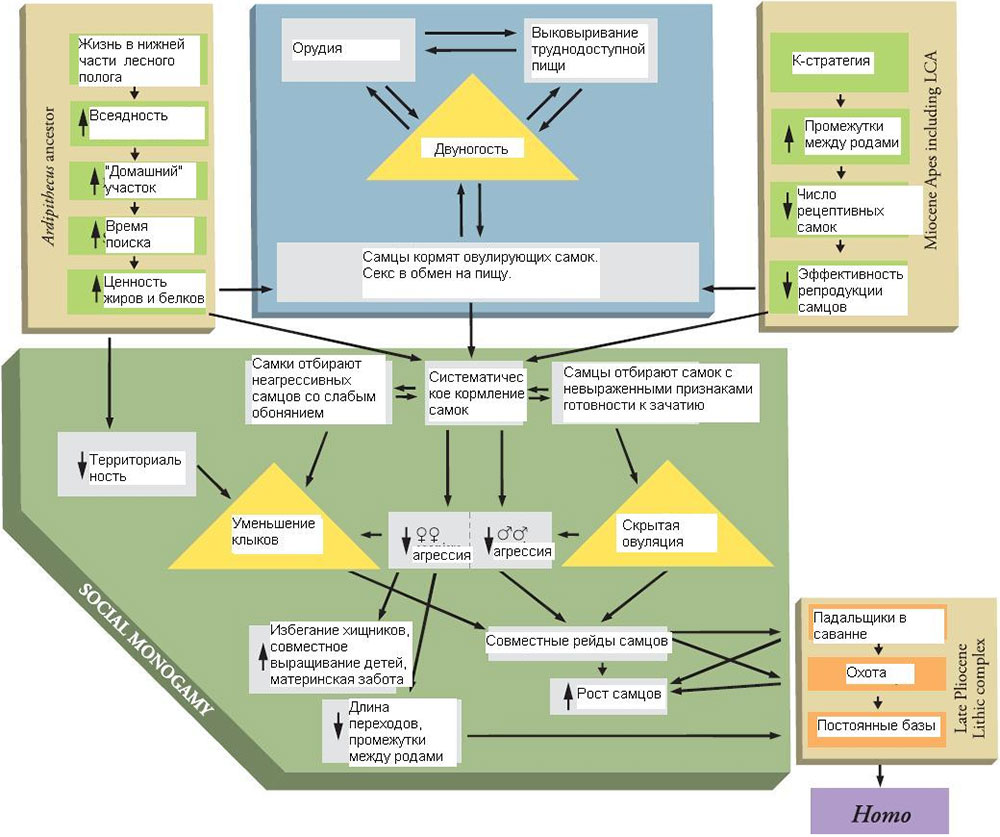 Данный адаптивный ландшафт порождён двумя группами факторов: пищевой стратегией ранних гоминид (представлена в левой колонке) и «демографической дилеммой», обусловленной интенсификацией К-стратегии (правая колонка). Селективное давление, вызываемое этими факторами, ведёт к развитию стратегии «секс в обмен на пищу». Дальнейшее увеличение роста самцов и эффективная кооперация между самцами у представителей вида Australopithecus afarensis обеспечили эффективность коллективных рейдов по добыче пропитания. Впоследствии это помогло освоить добычу падали в саванне и коллективную охоту. Такая «экономическая революция» способствовала совершенствованию адаптаций к двуногому хождению, дальнейшему усилению внутригрупповой кооперации и снижению внутригрупповой агрессии, увеличению количества энергии, которую можно было выделить на выращивание потомства, росту рождаемости и выживаемости детей и ослабила ограничения, препятствующие развитию мозга.