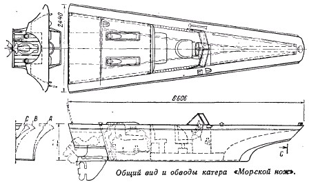 Обводы типа «Морской нож» отличаются дельтовидной формой судового корпуса с плоским и узким днищем в виде треугольника с раскрывом бортов 15° у форштевня. Для повышения всхожести на волну борта плавно расходятся к палубе подобно лемеху сельскохозяйственного плуга. Верхняя часть форштевня оснащается транцем, нижняя часть — срезана и заострена подобно лезвию ножа[3].