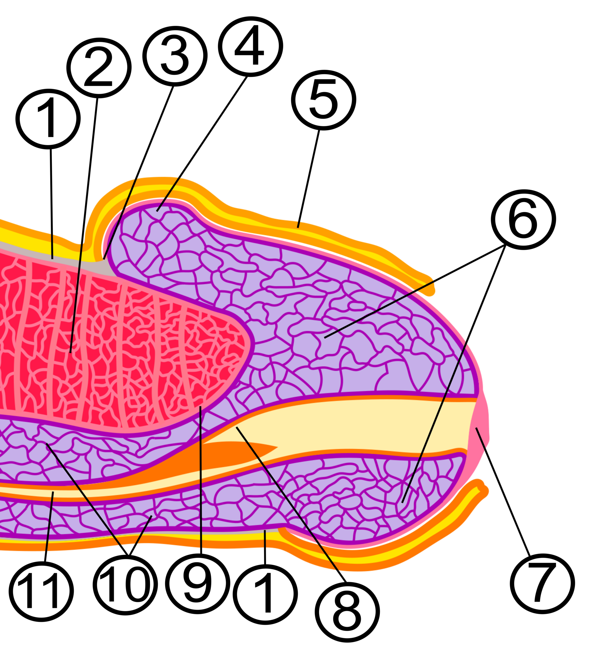 Кожа, которая покрывает тело полового члена, тонкая и подвижная, переходя в кожу лобка вверху и мошонки внизу. Крайняя плоть прикрепляется к коже головки уздечкой крайней плоти, у которой тонкая почти прозрачная внутренняя поверхность содержит железки[3]. Тело полового члена состоит из двух тканей, которые напоминают губку, и одной другой ткани. Задняя часть губчатой ткани заканчивается луковицей, а передняя — головкой. Внутри губчатой ткани проходит мочеиспускательный канал, который расширяется в головке и образует ямку. Ткани имеют цилиндрическую форму, и их задние концы прикреплены к кости таза[6].