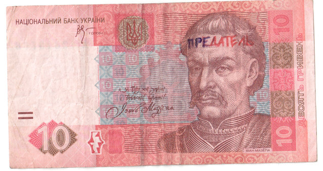 - подпись под портретом Мазепы (на 10 гривнях) «предатель» (2009 год).