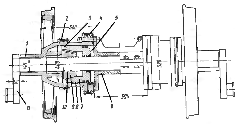 Муфта (см.рисунок) состоит из ступицы 1, отлитой вместе с колёсами, корпуса 6, соединённого с нею болтами, и чугунного поршня 7, который может скользить вдоль ступицы и благодаря шпонке 8 вращаться только с ней. Иными словами, ступица, корпус и шпонка должны вращаться вместе с колёсами. Насадка 9 шпонкой 10 жёстко соединяется с осью 11, которая должна приводиться во вращение дизелем. Направляя сжатый воздух через кольцо 4 в полость 5 и сдвигая тем самым поршень 7 влево, можно было заклинить колесо с осью. Подачей воздуха через кольцо 2 в полость 3 производится расцепка их. При такой конструкции наиболее трудно было подвести к вращающимся муфтам сжатый воздух из резервуаров, укрепленных на раме локомотива. Проверка работоспособности такой передачи была произведена на паровозе типа 0-3-0 серии Т с наружными рамами. Муфта, изготовленная Оренбургскими мастерскими, работала неудовлетворительно (вследствие значительной утечки воздуха).