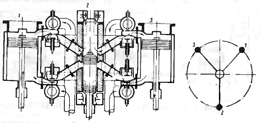 В воздушном цилиндре 1 (см. рисунок) происходит предварительное сжатие рабочего воздуха, в цилиндре 2 — последующее сжатие, горение и расширение, которое затем продолжается в расширительном цилиндре 3, откуда продукты горения выталкиваются наружу. Охлаждаемый поршень цилиндра 2 служит в то же время выпускным золотником для цилиндра 3. Цилиндры 1 и 3 имеют шатуны, расположенные почти под прямым углом, что облегчает разгон, совершаемый воздухом. Благодаря такому расположению цилиндров перемена хода достигается почти без перестановки распределительных органов обращением цилиндра 1 в расширительный, а цилиндра 3 — в воздушный.