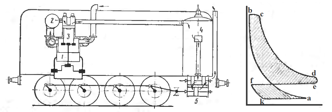 Воздух, сжатый в зарядном компрессоре 1 до 3 — 4 атм, поступает в воздушный ресивер 2 и затем (в период впуска) через впускной клапан в цилиндр 3 сгорания, заполняя весь его полезный объём ka (см. график). В нижней мёртвой точке хода поршня цилиндр сгорания разобщается от воздушного ресивера и воздух при ходе поршня вверх сжимается по линии ab до 60 атм. Около верхней мёртвой точки впрыскивается нефть, которая сгорает по линии bc, а с точки c начинается расширение газов по линии cd. Около точки d в цилиндр впрыскивается вода с воздухом для охлаждения газов. В точке е открывается выпускной клапан и при ходе поршня по линии ef газы при давлении 9 атм и температуре 380—400 °C выталкиваются в специальный газовый ресивер 4. В точке f выпускной клапан закрывается, а оставшиеся газы с ходом поршня вниз расширяются по линии fk до точки k, где вновь открывается впускной клапан, воздух из воздушного ресивера вновь впускается в цилиндр сгорания и цикл повторяется. Из заряженного таким образом газового ресивера горячие газы поступают в поршневую тяговую машину 5.