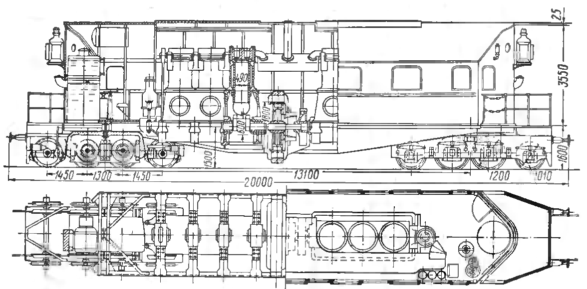 На тепловозе предполагалось установить двухтактный дизель 1 простого действия (диаметр цилиндров 400 мм и ход поршня 550 мм), коробку передач 2 с тремя ступенями, на которых касательная сила тяги составляет 8000, 5550 и 4500 кГ при скоростях соответственно 56, 80 и 100 км/ч; холодильник 3 для воды и масла, компрессор 4, топливные баки 5 и пусковые баллоны 6. Согласно расчётам автора, тепловоз должен развивать на ободе колёс мощность до 1630 л.с., а на валу двигателя — 1870 л.с. (при к.п.д. 16 — 20 %).