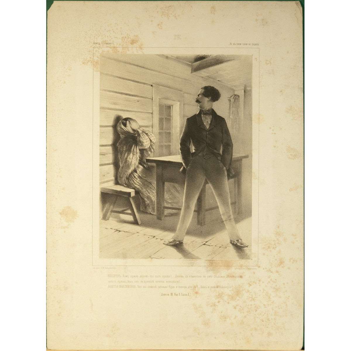 В. Я. Лакшин, посвятившей этой пьесе Островского отдельную главу[10], рассказывал о проблемах, с которыми столкнулся автор. Император Николай Первый решил издать указ, что все пьесы должны сначала ставиться в Петербурге, дабы он самолично мог быть цензором и отслеживать уровень верноподданичества произведения. И это как раз тогда, когда репетиции «Не в свои сани…» уже шли полным ходом в московской труппе! Островский пребывал в ужасе, но какая-то мудрая сила заставила императора отказаться от идеи. Репетиции в Москве спокойно продолжились. Островский занимался с каждым актером, готовившим роль, объясняя и определяя тон и манеры персонажей.