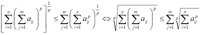 Обобщённое неравенство Минковского — неравенство, гласящее, что корень p-степени из суммы p-степеней сумм i-ых чисел m наборов не больше суммы m корней p-степени из сумм p-степеней n чисел j-ого набора.