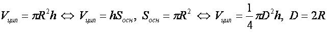 - Невозможно разобрать выражение (Ошибка преобразования. Сервер («https://wikimedia.org/api/rest_») сообщил: «Cannot get mml. Server problem.»): {\displaystyle V_{\text{цил}}=\pi R^{2}h\Leftrightarrow V_{\text{цил}}=hS_{\text{осн}},\ S_{\text{осн}}=\pi R^{2}\Leftrightarrow V_{\text{цил}}={\frac {1}{4}}\pi D^{2}h,\ D=2R}
