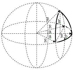 α — угол между радиусом основания, соединяющим центр основания полушара и край линии сечения, и горизонтальной осью (проходящей через центры основания и линии сечения);