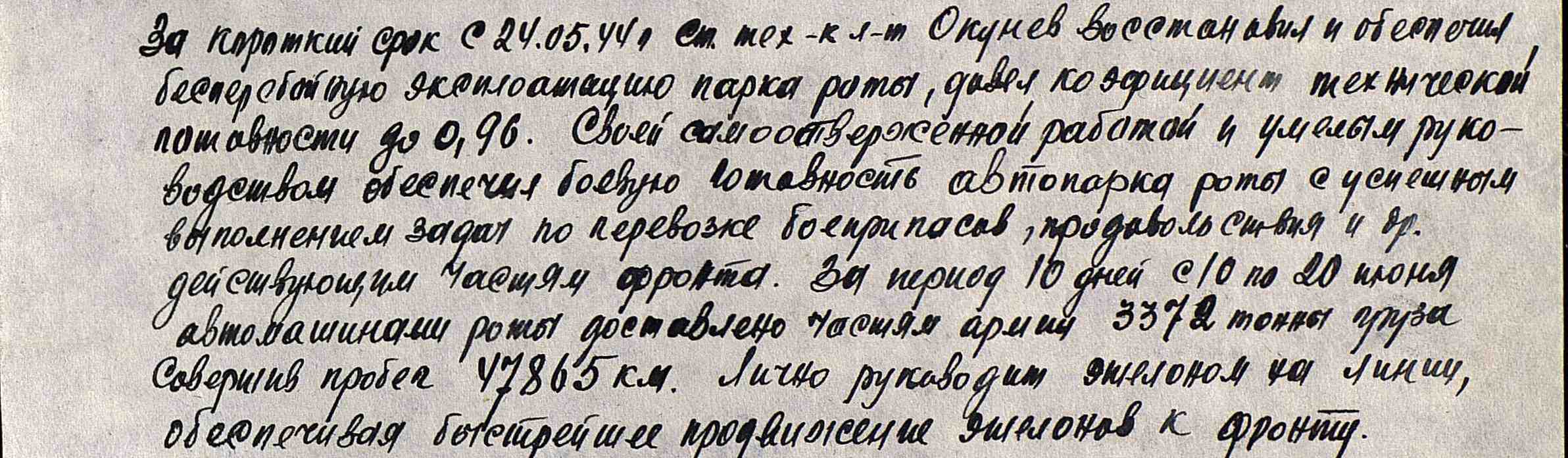 За короткий срок с 24.05.44 г. ст. тех-к л-т Окунев восстановил и обеспечил бесперебойную эксплуатацию парка роты, довел коэффициент технической готовности до 0,96. Своей самоотверженной работой и умелым руководством обеспечил боевую готовность автопарка роты с успешным выполнением задач по перевозке боеприпасов, продовольствия и др. действующим частям фронта. За период 10 дней с 10 по 20 июня автомашинами роты доставлено частям армии 3372 тонны груза, совершив пробег 47865 км. Лично руководит эшелоном на линии, обеспечивая быстрейшее продвижение эшелонов к фронту. За умелое руководство, самоотверженную работу и отличное содержание техники ст. техник-лейтенант Окунев достоин правительственной награды орденом "Красная звезда".Командир 182 ОАТБ гв. капитан Захарченко, 26 июня 1944 г.