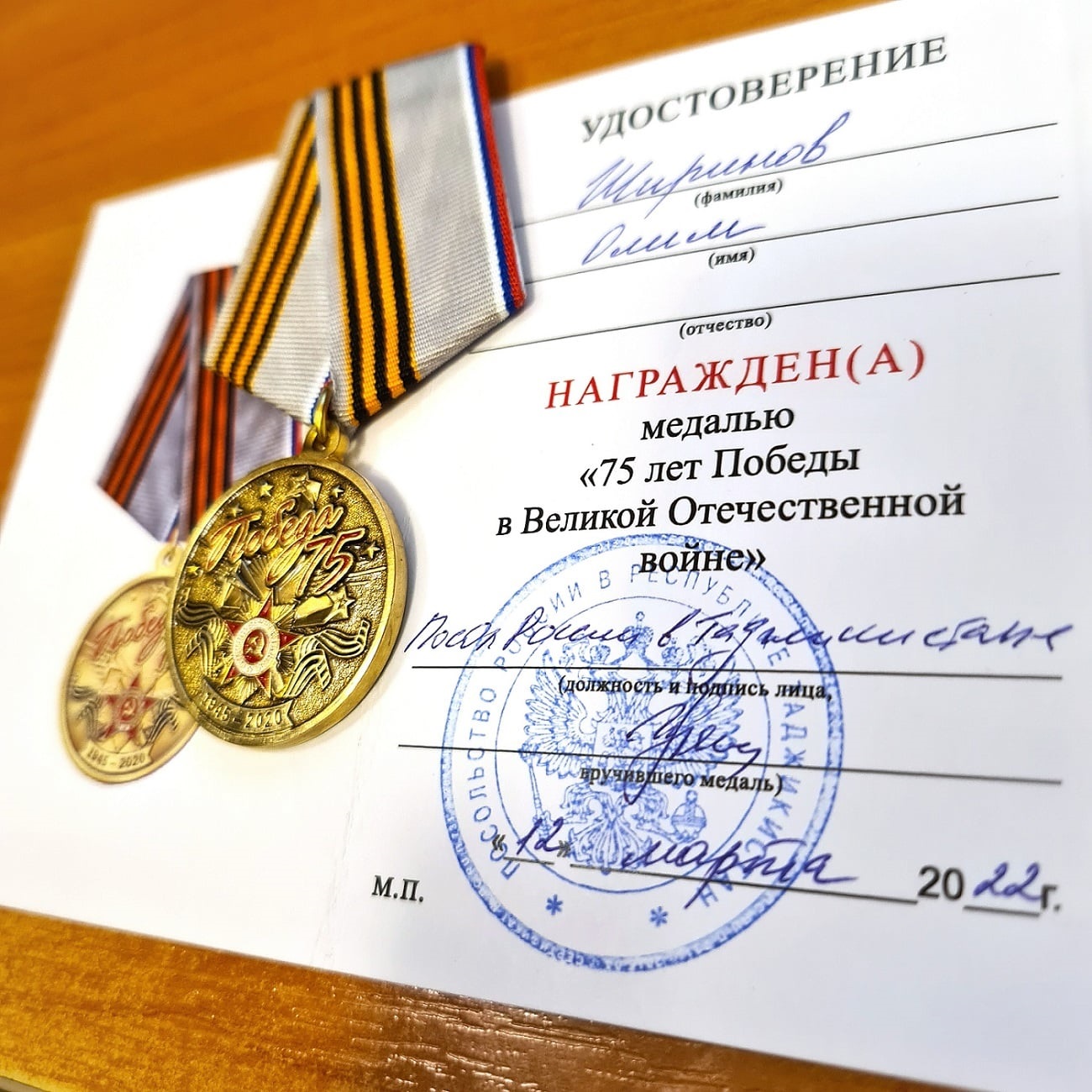 12 марта 2022 года послом России в Республике Таджикистан И.С. Лякиным-Фроловым Олим Ширинов награждён памятной медалью «75 лет Победы в Великой Отечественной Войне 1941-1945 гг.» [15]