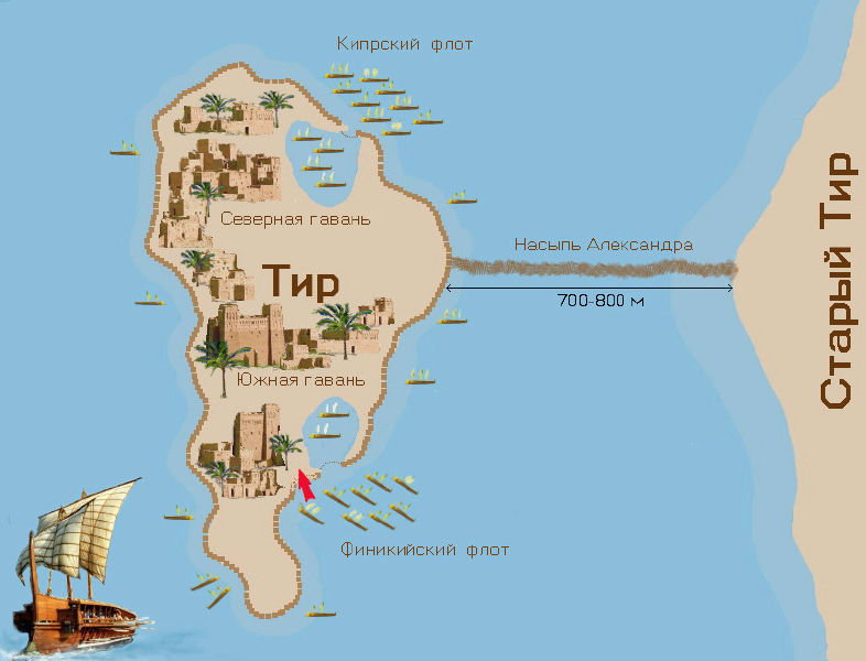 - Александр подплывал к городу; тирийцы никакого сопротивления не оказывали. Он решил не брать гавани, обращенной в сторону Сидона, видя, что вход туда узок, а кроме того, забит множеством триер, обращенных к нему носами. На три триеры, стоявшие далеко от входа в гавань, напали финикийцы и потопили их, пробив носами. Экипаж этих триер легко спасся, добравшись вплавь на родной берег. Флот Александра пристал недалеко от воздвигнутой насыпи, в месте, защищенном от ветра. На следующий день он приказал, чтобы кипрский флот с навархом Андромахом во главе блокировал гавань, обращенную в сторону Сидона, а финикийцы - находившуюся по ту сторону насыпи и обращенную к Египту. Здесь же была и его палатка[1].
