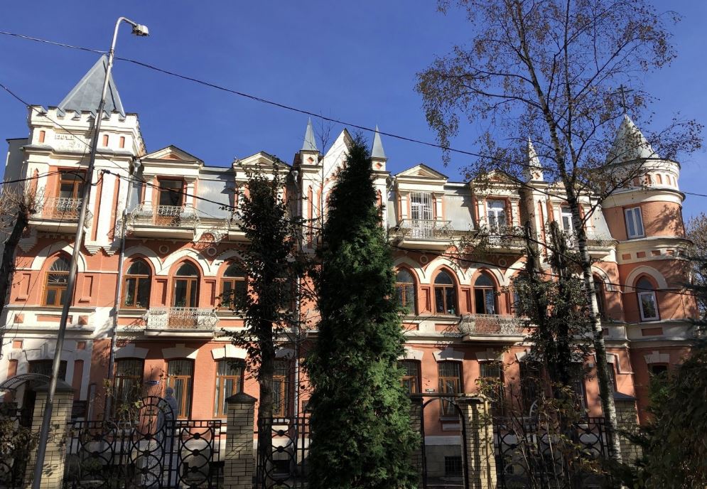 Углы юго-западного (главного, выходящего к Свято-Никольскому собору) фасада декорированы средневековыми башнями в готическом стиле. Восточная башня круглая, со скруглённым балконом в уровне второго этажа и с остроконечным завершением. Западная башня квадратная, с висячими пилястрами, с главным входом в уровне первого этажа, балконом в уровне мансардного этажа и четырёхскатной кровлей-епанчей из металла с ромбовидными скосами[6].