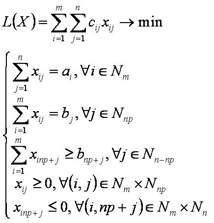 cm+1j<0, j=np+1,n — транспортные тарифы на перевозку единицы продукции с фиктивного склада к потребителю;
