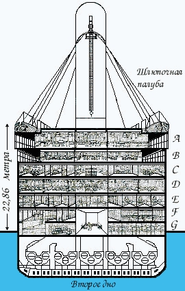 Всего на корабле было 8 палуб, верхняя — для шлюпок, остальные 7 находились под шлюпочной палубой и имели буквенные обозначения: A, B, C, D, E, F, G.