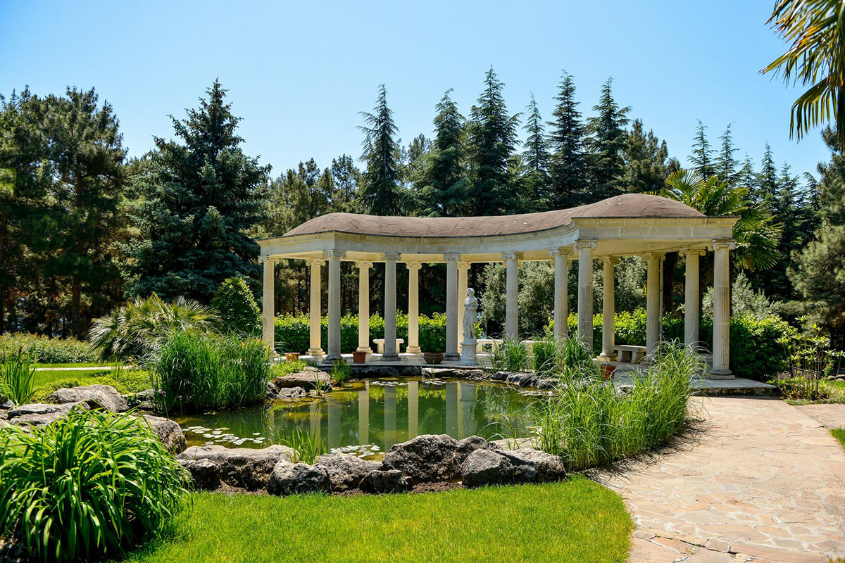 На территории установлены реплики классических произведений античной скульптуры, в том числе Ника Самофракийская и «Мальчик, вынимающий занозу». Центральным объектом композиции является ротонда у озера. В нижнем ярусе парка также размещена акустическая ротонда, спроектированная таким образом, чтобы усиливать звуки[1].