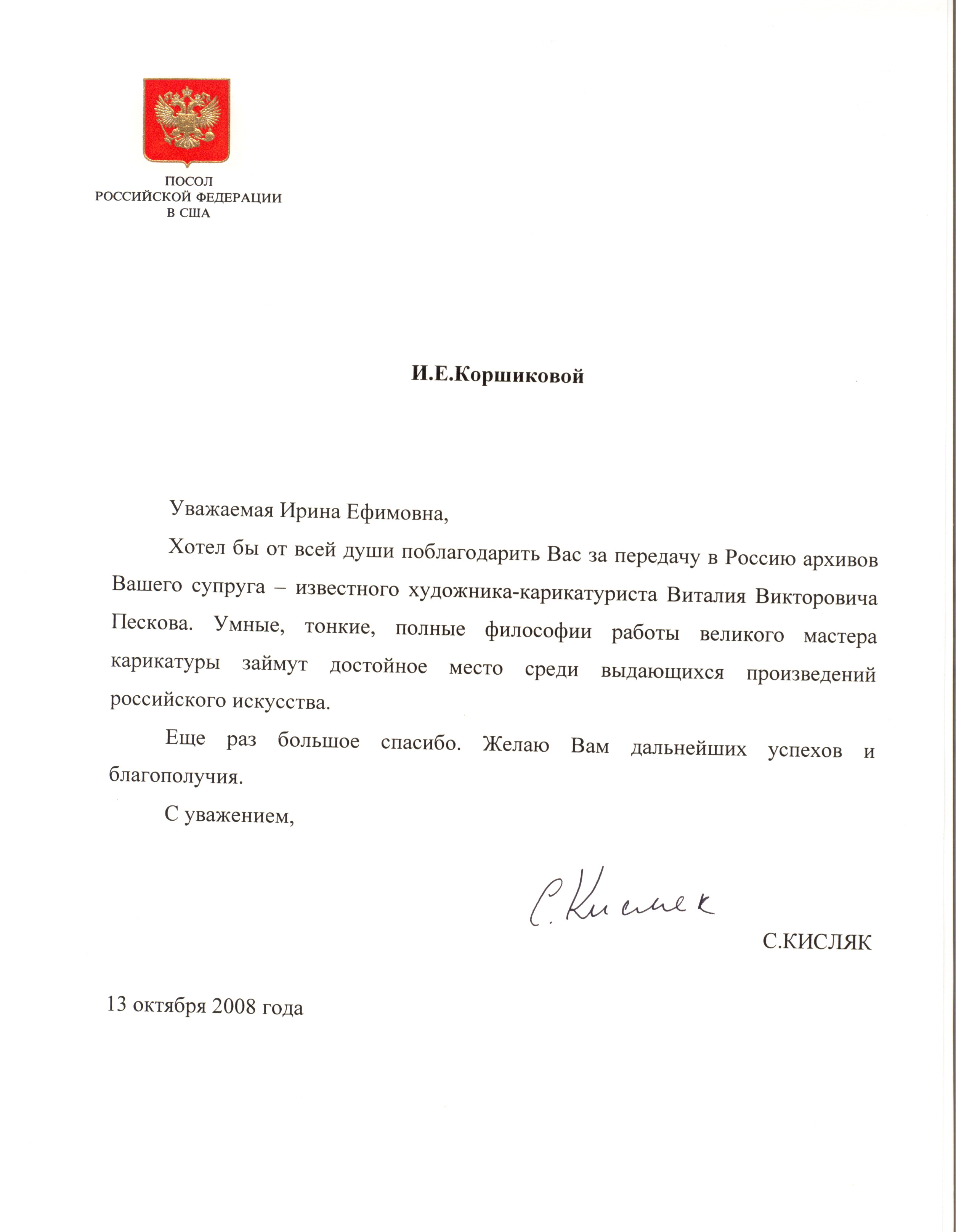 В 2008 году Ирина Ефимовна Коршикова безвозмездно передала весь имеющийся у нее архив (рисунки, фотографии, публикации, письма и записки художника, а также последующая переписка с деятелями культуры, Прокуратурой, Министерством культуры РФ, Московской мэрией и т. д.) в Российский государственный архив литературы и искусства (см.Передача в РГАЛИ документов В. В. Пескова и Архивы России: «Во время командировки был принят на хранение архив художника-карикатуриста Виталия Пескова (приблизительно 3 тысячи рисунков) от его вдовы Ирины Коршиковой»), за что получила специальную благодарность от правительства Российской Федерации[3].