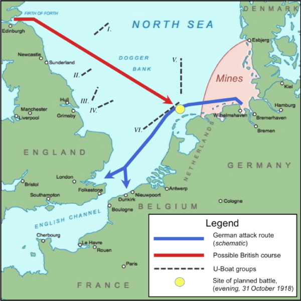В тоже время Флот открытого моря Германии на октябрь 1918 года насчитывал лишь 18 дредноутов и 5 линейных крейсеров, в то время как американо-британский флот располагал 35 дредноутами и супердредноутами, 11 линейными крейсерами, 3 авианосцами и т. д.