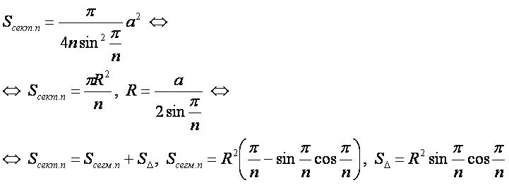 - Sсегм.n — площадь сегмента описанной окружности правильного n-угольника;