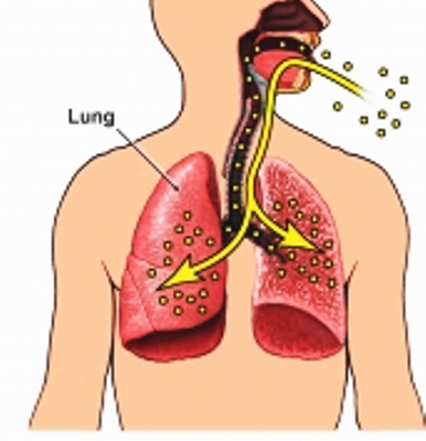 Попавшие в организм артроспоры гриба в трахее и бронхах[29]. У больных возникает пневмония, лихорадка, боль, кашель и озноб. При этом заболевании наблюдаются очаги в лёгких с некрозом в центре и казеозным распадом напоминающие каверны при туберкулёзе. В грануляционной ткани содержится большое количество полинуклеаров, макрофагов, эпителиоидных и гигантских клеток, сферул и эндоспор; эндоспоры нередко фагоцитированы, мицелий, как правило, отсутствует[30].