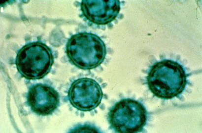 Кокцидиодоз (coccidiodomycosis) вызывают паразитические грибы Coccidioides immitis[26]. Заражение происходит ингаляционным путём[27]. При вскрытии инфильтратов, которые наблюдаются у больных, выделяется большое количество гноя, имеющего неприятный запах[28].
