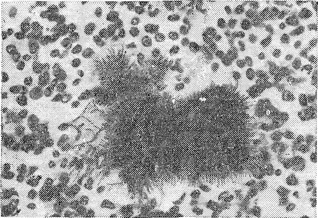 Болезнь характеризуется развитием абсцессов, бронхопневмонии, опухолевидных поражений с клеточными элементами острого и хронического воспаления. Многочисленные грибы окружены лимфоидными и гигантскими клетками[25].
