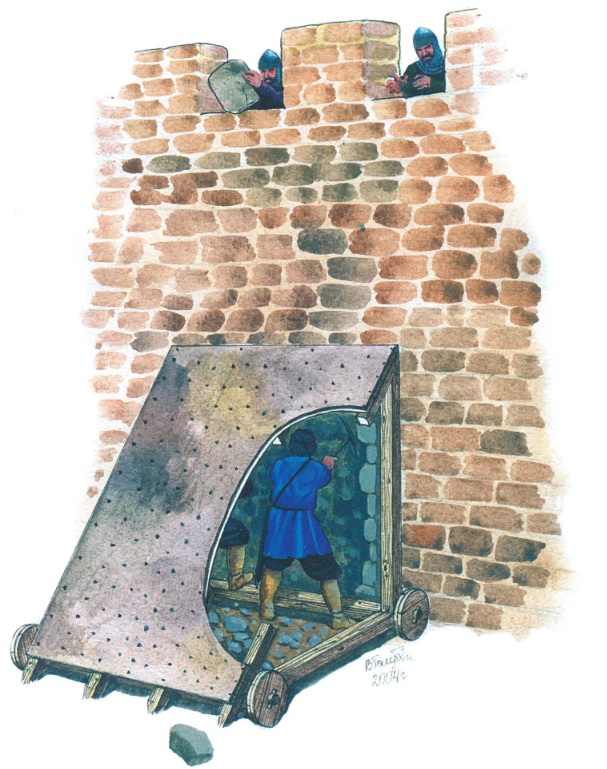 Под прикрытием подобной черепахи прямо у подножия ограды осаждающие могли относительно безопасно организовать работу сапёров, которые кирками выдалбливали стену, вынимая оттуда камень за камнем. В высоту и в ширину стену стремились разбить по габаритам черепахи, а в глубину — на половину толщины стен. Подобные работы Аполлодор рекомендовал организовывать массово, разбивая стену одновременно в нескольких точках, не далее чем 5,9 метра друг от друга. Пробившись на некоторую глубину внутрь стены черепахи становились не нужны и сапёры продолжали бить стену уже под прикрытие её самой. Для предотвращения обрушений на головы сапёров выбитый участок в подножии стены подпирался деревянными опорами. После достаточного заглубления внутрь в какой-то момент этот объём заполнялся хворостом, дровами, другими горючими материалами и поджигался, что чаще всего приводило к обрушению стен[1].