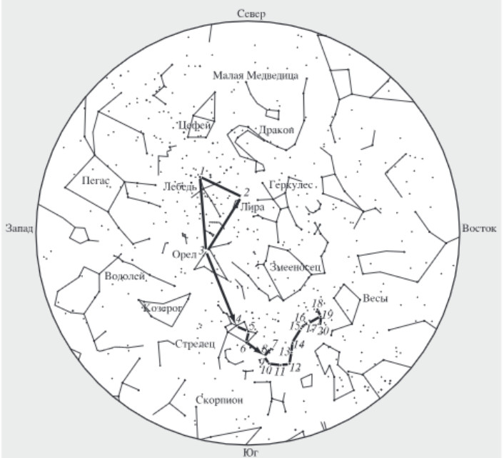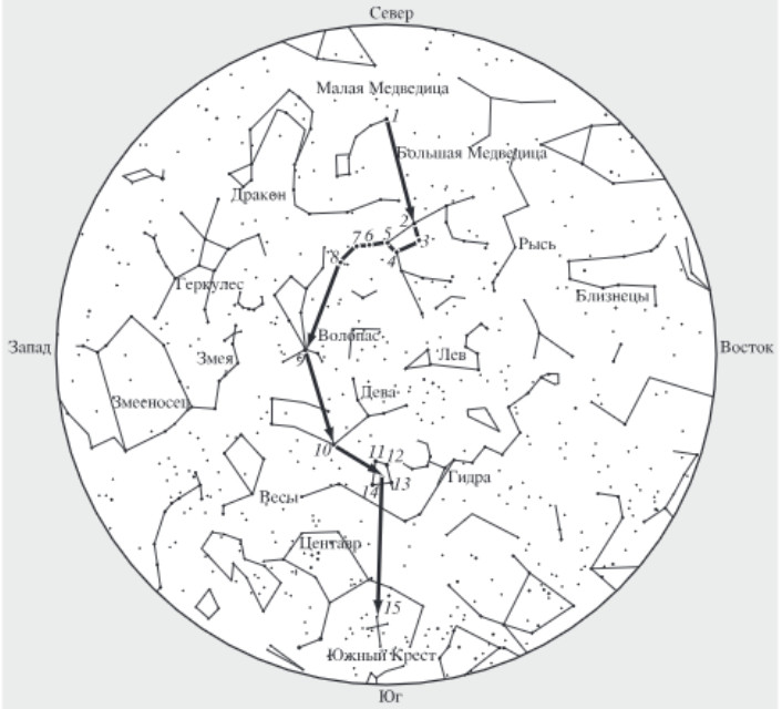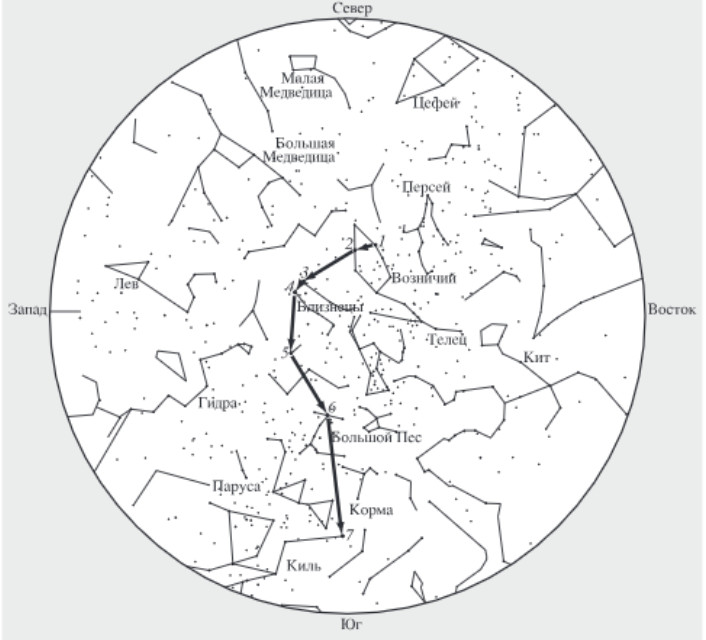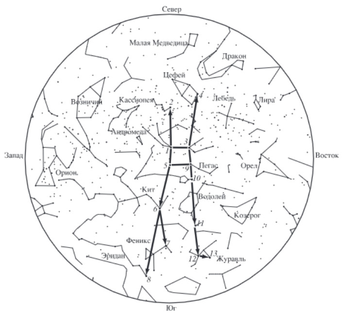 Для определения сторон света ночью при частичной облачности на звёздном небе из самых ярких звёзд выделяли четыре специальные «навигационные пути» для различных маршрутов и сезонов года, мысленно соединяя их ломаными линиями. Все они тянулись с севера на юг: