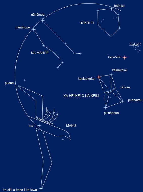 - «Рыболовная леска» (по-гавайски Манаиакалани) — этот путь соединял 20 звёзд: первые три — Вега (Кеое — «сладкий картофель батат»), Денеб (Пирайетея — «белая морская ласточка»), Альтаир (Хуму — «сыновья навигатора») — формируют «треугольник». Далее путь проходит по звёздам, оканчивающихся хвостом созвездия Скорпиона или «Рыболовным крючком»: Нанто, Каус Медиа, Каус Аустралис, Шаула, Гиртаб, Аполлон, Саргас, Граффиас, ξ2 Скорпиона, Денебакраб, Вей, Альниуат, Антарес, Алният Акраб, Джубба, Вришика.
