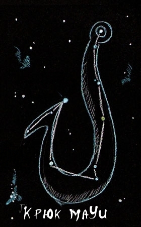 Созвездие Рыболовный крючок (Камакау-нуиамауи) совпадало с изогнутым «хвостом» Скорпиона с яркой звездой Антареса (Као — «остриё»). Согласно легенде, именно его забросил на небо полубог Мауи, чтобы поймать одну из Длинных Акул (прозвище Млечного Пути, разделяемого надвое). Центральная часть созвездия Ориона на Гавайях называлась Детская верёвочка («Ка хеи-хеи о на кейки»), по игре, переплетающей нити на пальцах в фигуру «паук».[3] Магеллановы Облака на островах Тонга именовали «Ма’афу леле» — «Летучий огонь» и «Ма’афу тока» — «Стоячий огонь», а на Фиджи называли «Матадраву-ни-сауту» — «Очаг мира и изобилия».