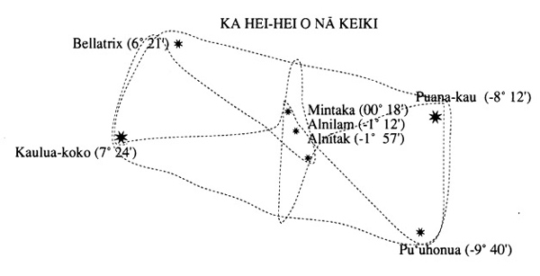 - «Хребет (ящерицы)» (по-гавайски Каивикуамоо) соединял 15 звёзд: Полярная (Хокупайя — «закреплённая звезда»), далее шла так называемая «Звёздная семёрка» (Нахику) — ярчайшие звёзды Большой Медведицы (на островах Кука это созвездие Крысы — «Киоре») — Дубхе (Хику-кахи — «первая звезда»), Мерак (Хику-луа — «вторая звезда»), Фегда (Хику-клоу — «третья звезда»), Мегрец (Хику-аха — «четвёртая звезда»), Алиот (Хику-лима — «пятая звезда»), Мицар (Хику-оно — «шестая звезда») и Бенетнаш (Хику-пау — «седьмая звезда»); затем Арктур (Хокулеа — «звезда счастья», зенитная звезда Гавайев), Спика (Хикиналия — «яркая звезда»), четыре звезды астеризма Мее («голос радости») — Альгораб, Гиенах, Мигкар и Краз, замыкала навигационный путь звезда Гакрукс.
