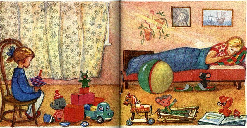 Главная героиня стихотворения — маленькая девочка, которая боится потревожить маму, которая устала и легла отдохнуть. Ребёнок замечает солнечный луч, который «крадётся» по маминой подушке и сообщает ему, что ей тоже хочется двигаться и заниматься разными делами[3]: играть с заводным волчком, читать вслух книгу, катать по полу мячик, петь песни и хохотать, но она не делает этого, потому что шум может разбудить маму. Поэтому девочка тихо сидит в комнате и старается не потревожить мамин сон[1].