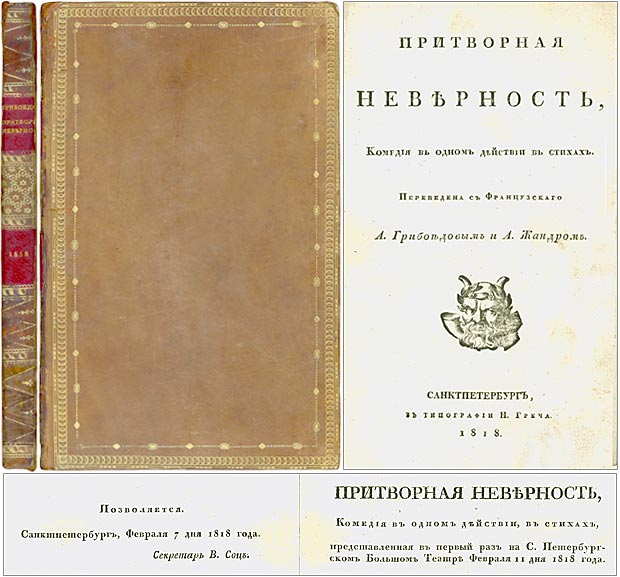 - ↑ 7,0 7,1 7,2 7,3 Грибоедов А., Жандр А. Притворная неверность. Комедия в одном действии в стихах. Спб, 1818.