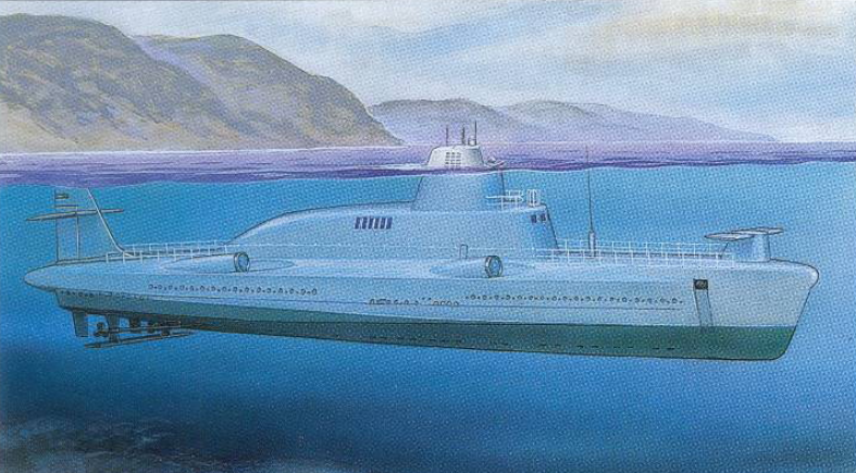 По версии же Афрамеева и Широкорада, идея такого необычного корабля принадлежит Н. С. Хрущеву, который во время посещения военно-морской базы в Балаклаве увидел стоящие рядом друг с другом подлодки и ракетные катера, что натолкнуло его на мысль погрузить весь флот под воду в целях обеспечения скрытности в случае ядерной войны[3]. Изначально Хрущев поставил задачу создать катер, способный летать в воздухе, перемещаться по поверхности воды, нырять и плавать под водой. Но конструкторы убедили Хрущева, что гибрид самолета с надводным кораблем и подводной лодкой принципиально невозможен, после чего от свойств самолета в проекте отказались[11][12][13].