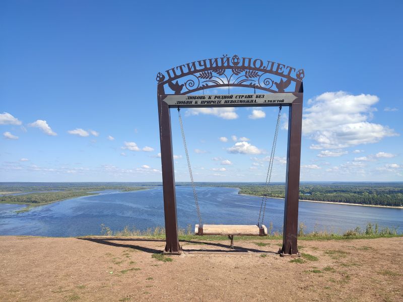 На мысе Птичий полёт размещены железные ворота с качелями. Посещение смотровой площадки бесплатное[5]. Также здесь из железобетонных плит выполнен элемент Древа жизни, что присутствует как на гербе Чувашской Республики, так и на его флаге[3].