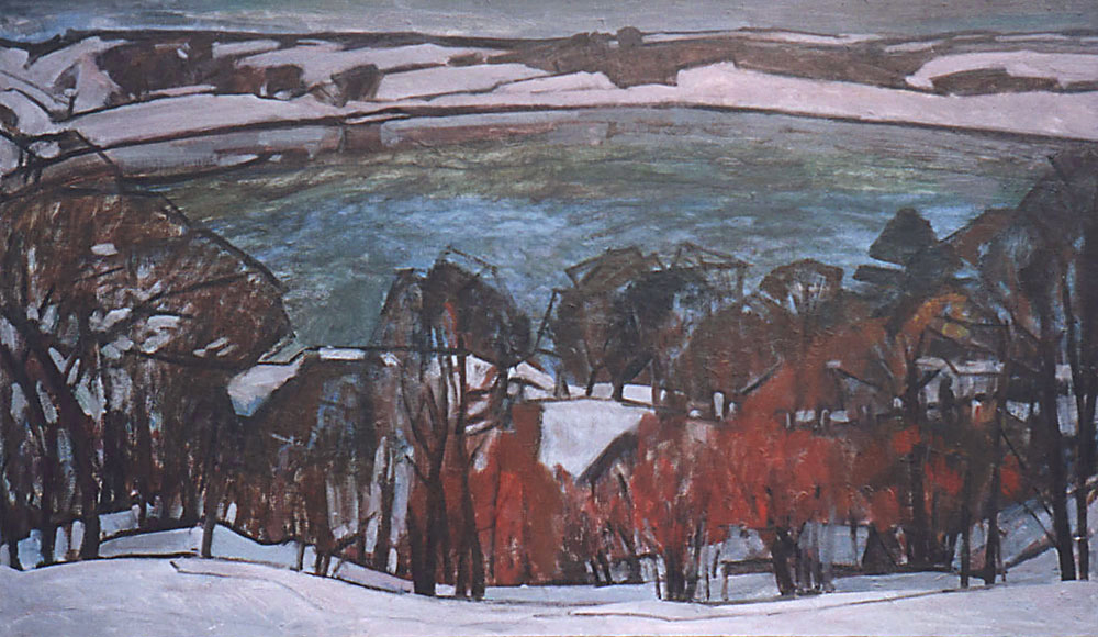 Постепенно, к концу 1960-х поиски вывели Н. Тимкова на композицию, которая станет определяющей для этих мотивов. Вместо поля под снегом в работах появляется холодная гладь Мсты и высокий берег с полуоблетевшими тополями под снегом и затерянными между ними домиками. Художник варьирует композицию, избирая то вид на Мсту с высокого берега, но напротив, с противоположного низкого берега на реку и противоположный высокий берег с тополями и деревней.