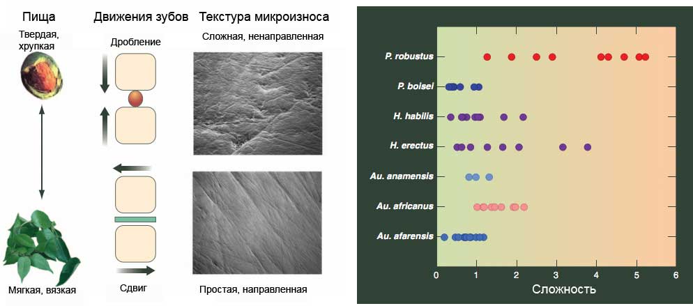 | Paranthropus robustus | С4-ресурсы — не более 30 %. | Самый сложный среди всех гоминид, варьирует у разных особей. | Орехи, семена, клубни. | |
