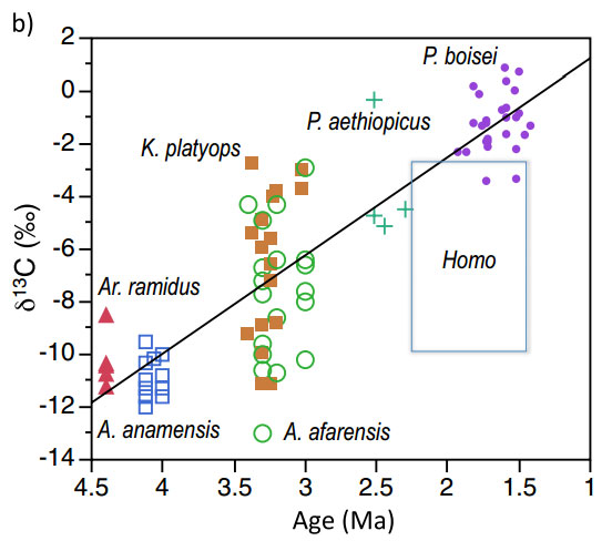 | Paranthropus aethiopicus | С4-ресурсы — более 50 %. | Преобладали саванные ресурсы. | ||