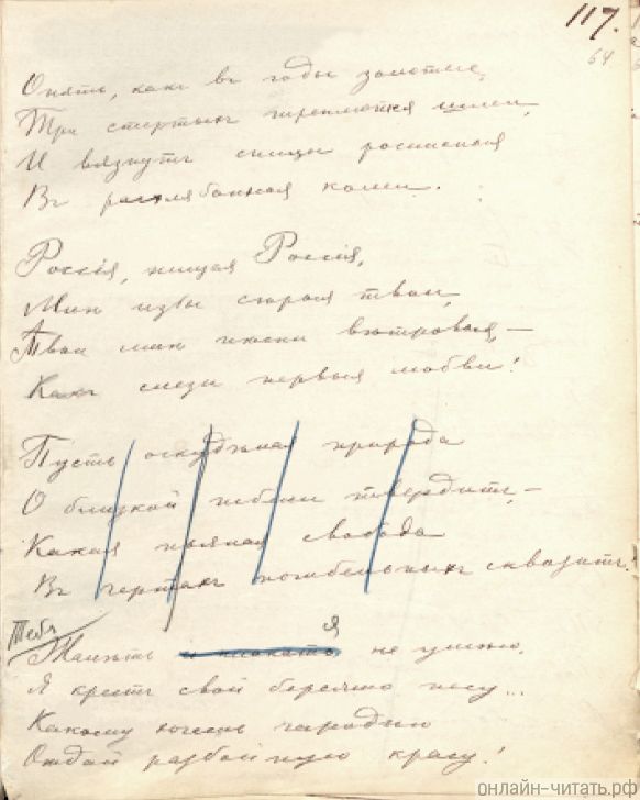 Впервые стихотворение было опубликовано в 1910 году в первом номере журнала «Новое слово» и в утреннем выпуске газеты «Биржевые ведомости» 17 января 1910 года)[2]. Текст впервые напечатанного стихотворения отличался от окончательного варианта и состоял из двенадцати строф (в окончательном тексте их шесть). Сохранились черновики стихотворения, содержащие ещё больше строф, а также прозаический план, в котором Россия представала в облике женщины, родившей сына: