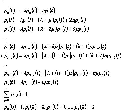 {\displaystyle {\begin{cases}p_{0}'(t)=-\lambda p_{0}(t)+\mu p_{1}(t)\\p_{1}'(t)=\lambda p_{0}(t)-(\lambda +\mu )p_{1}(t)+2\mu p_{2}(t)\\p_{2}'(t)=\lambda p_{1}(t)-(\lambda +2\mu )p_{2}(t)+3\mu p_{3}(t)\\\ldots \\p_{k}'(t)=\lambda p_{k-1}(t)-(\lambda +k\mu )p_{k}(t)+(k+1)\mu p_{k+1}(t)\\p_{k+1}'(t)=\lambda p_{k}(t)-(\lambda +(k+1)\mu )p_{k+1}(t)+(k+2)\mu p_{k+2}(t)\\\ldots \\p_{n-1}'(t)=\lambda p_{n-2}(t)-(\lambda +(n-1)\mu )p_{n-1}(t)+n\mu p_{n}(t)\\p_{n}'(t)=\lambda p_{n-1}(t)-n\mu p_{n}(t)\\\sum \limits _{i=0}^{n}p_{i}(t)=1\\p_{0}(0)=1,\ p_{1}(0)=0,\ p_{2}(0)=0,\ldots ,\ p_{n}(0)=0\end{cases}}}