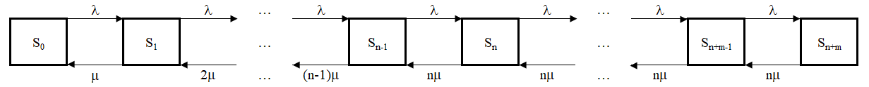 Sn+m – в системе имеется (n+m)-заявок, n из них обслуживаются n-каналами, а m-заявок ожидают в очереди;